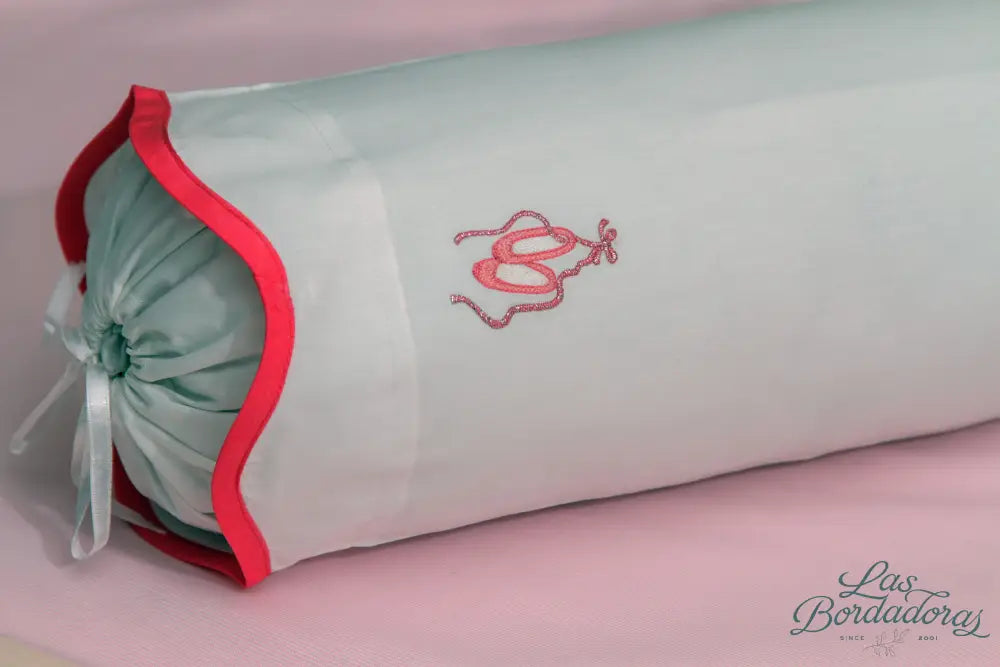 The bolster case is finished with a 2-inch flange on either end of the case and white satin ribbon drawstrings. The boudoir, more popularly known as the baby sham, comes with a 2-inch flange all around the case and an overlap back finish.