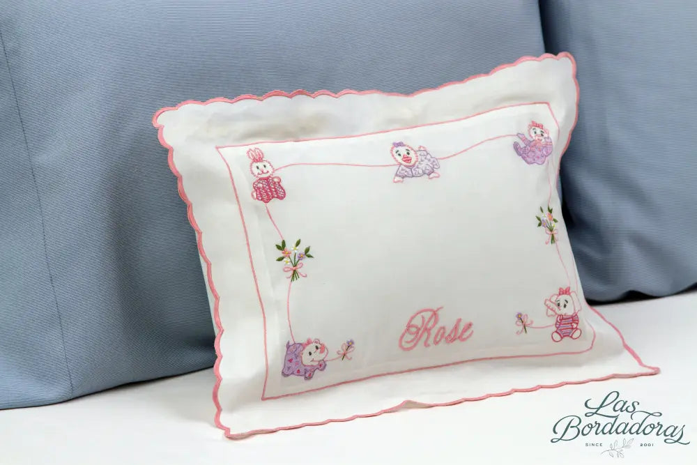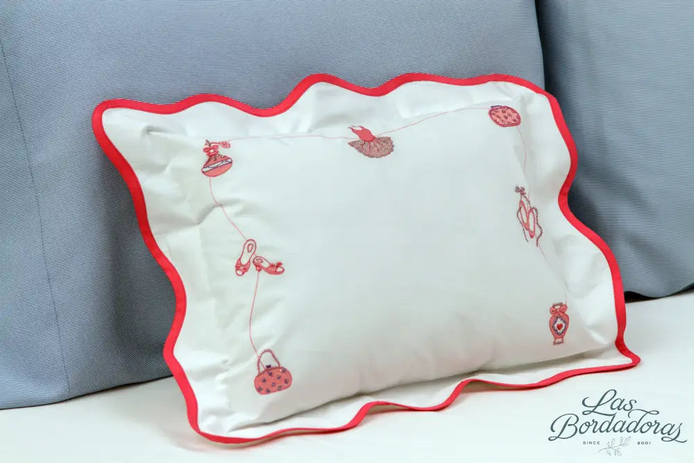 The boudoir cases, more popularly known as the baby sham, are made from 100% white 300 TC cotton fabric using 100% colorfast cotton embroidery threads. The cases feature a 2-inch flange all around and an overlap back finish.